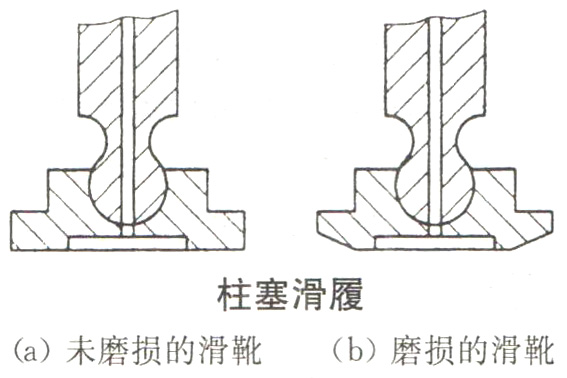 為了延長(zhǎng)液壓油泵的使用壽命,必須定期在油路的紊流處取出油樣檢驗(yàn)。保持油液的清潔度是系統(tǒng)維護(hù)保養(yǎng)的重要內(nèi)容,有時(shí)系統(tǒng)不能正常運(yùn)行,就是因?yàn)榭刂崎y閥芯被油污卡死,或產(chǎn)生阻尼、運(yùn)動(dòng)不暢。出現(xiàn)故障時(shí)又找不著其他原因,則清洗相關(guān)的控制閥(特別是比例閥)是重要的措施。軸向柱塞泵的損壞是從柱塞滑靴的磨損開始的,如下圖所示。當(dāng)滑靴磨損到不能形成與斜盤間的靜壓油膜時(shí),則滑靴與斜盤間的摩擦力增大,斜盤被拉傷,摩擦力進(jìn)一步增大,回程盤破裂,泵的內(nèi)部損毀,所以定期將磨損(還未完全損壞)的滑靴換掉就可以避免整泵的損壞。